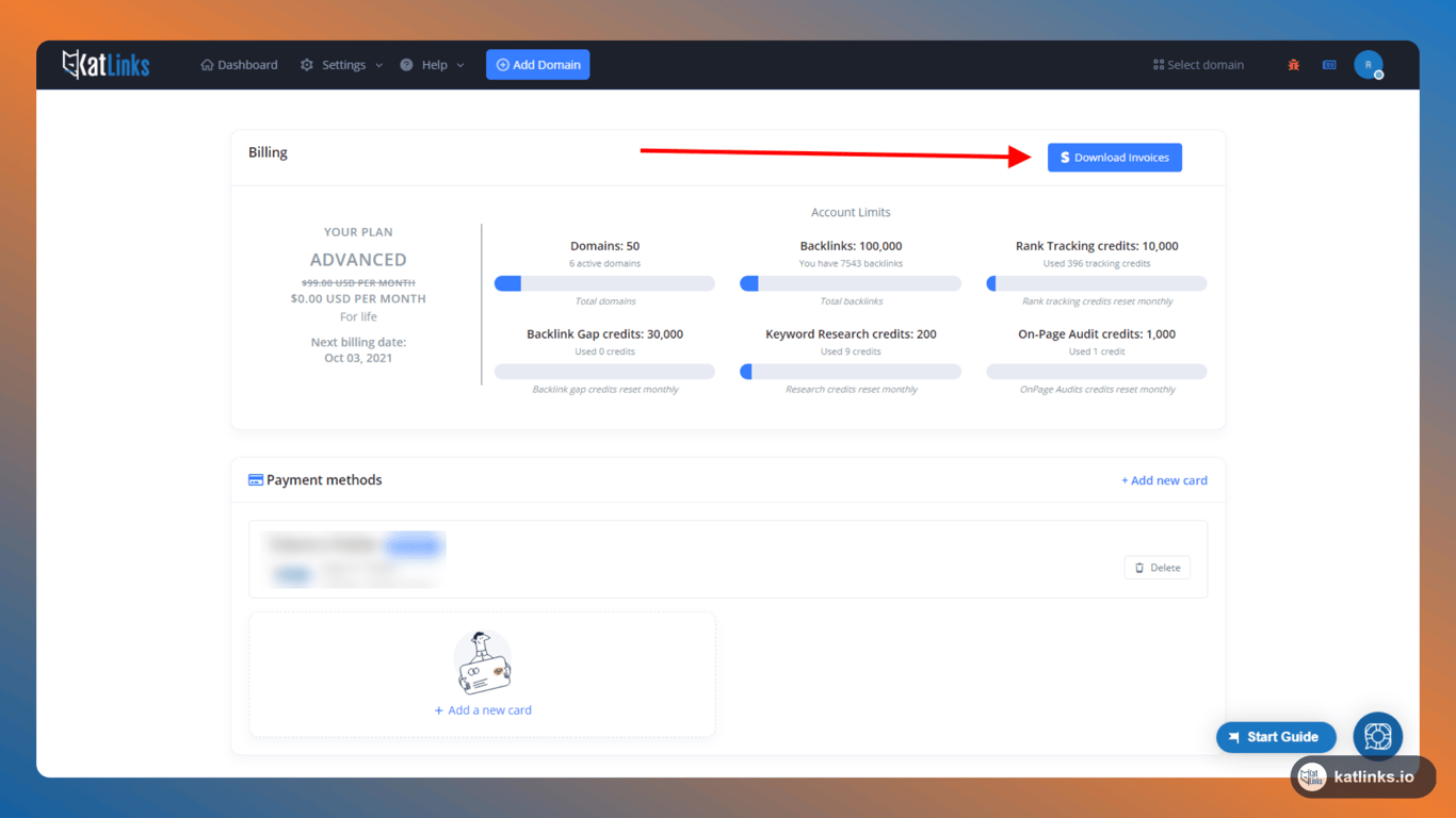We just made it super easy to download your KatLinks invoices. Just go to the billing page and click on the "Download Invoices" button. You will be taken to your Stripe dashboard where you can view and download all past invoices.