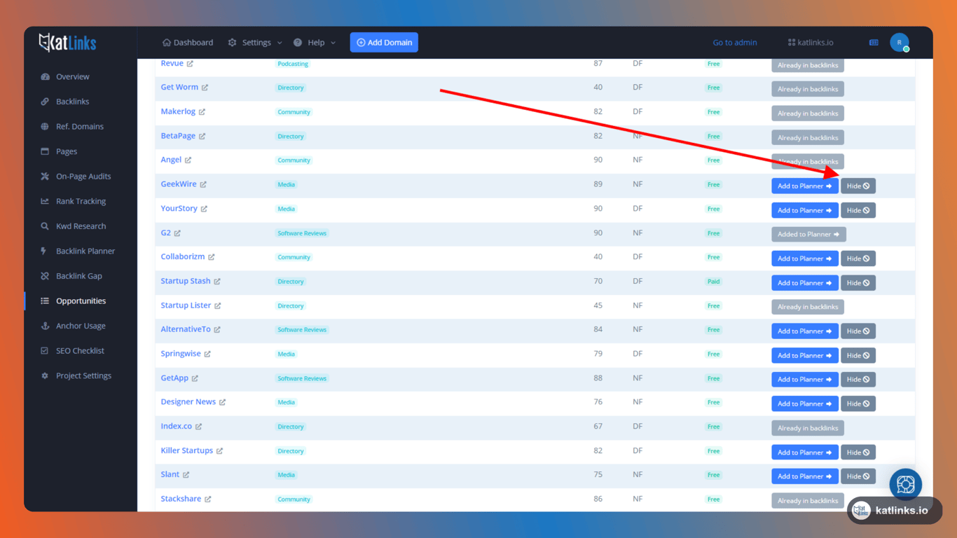 We just added a simple, but useful feature to the Backlink Opportunities. You can now hide the ones that you feel are not relevant to your website or business.