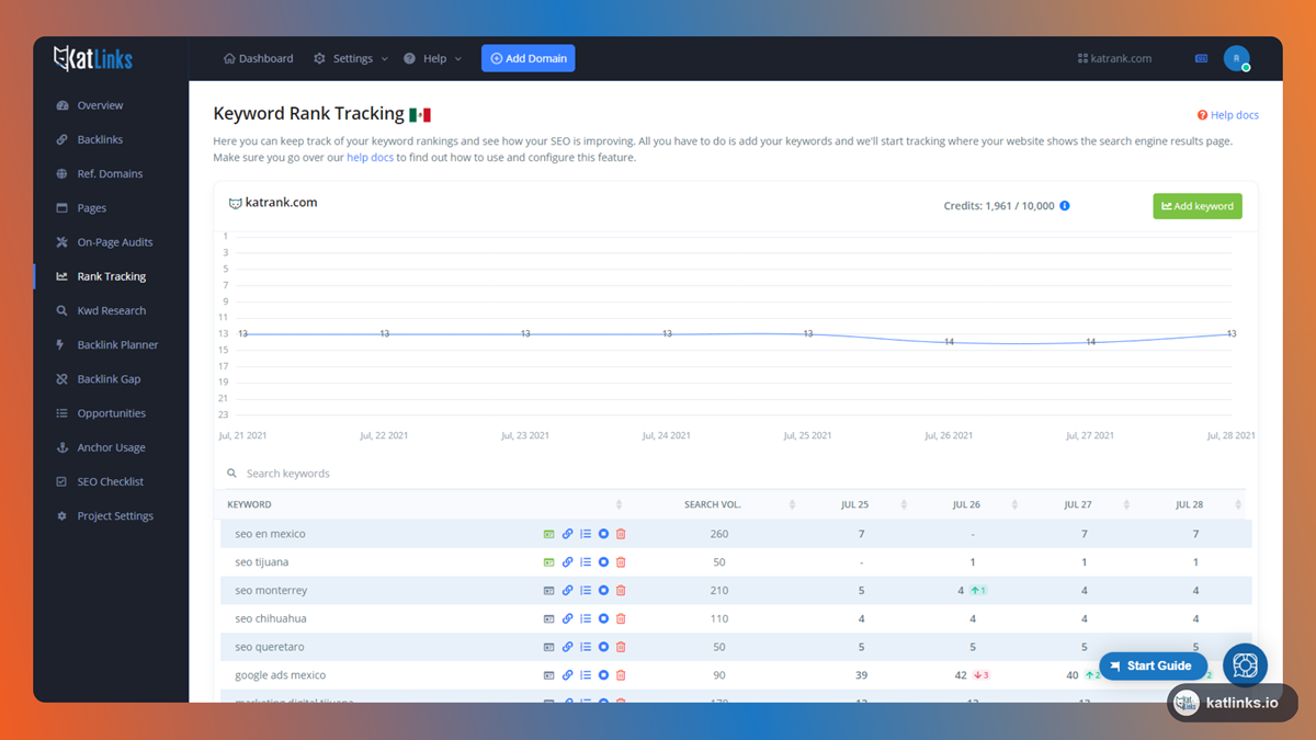 We have added a chart to the keyword rankings page that will show you the average rank of your keywords over the last seven days.