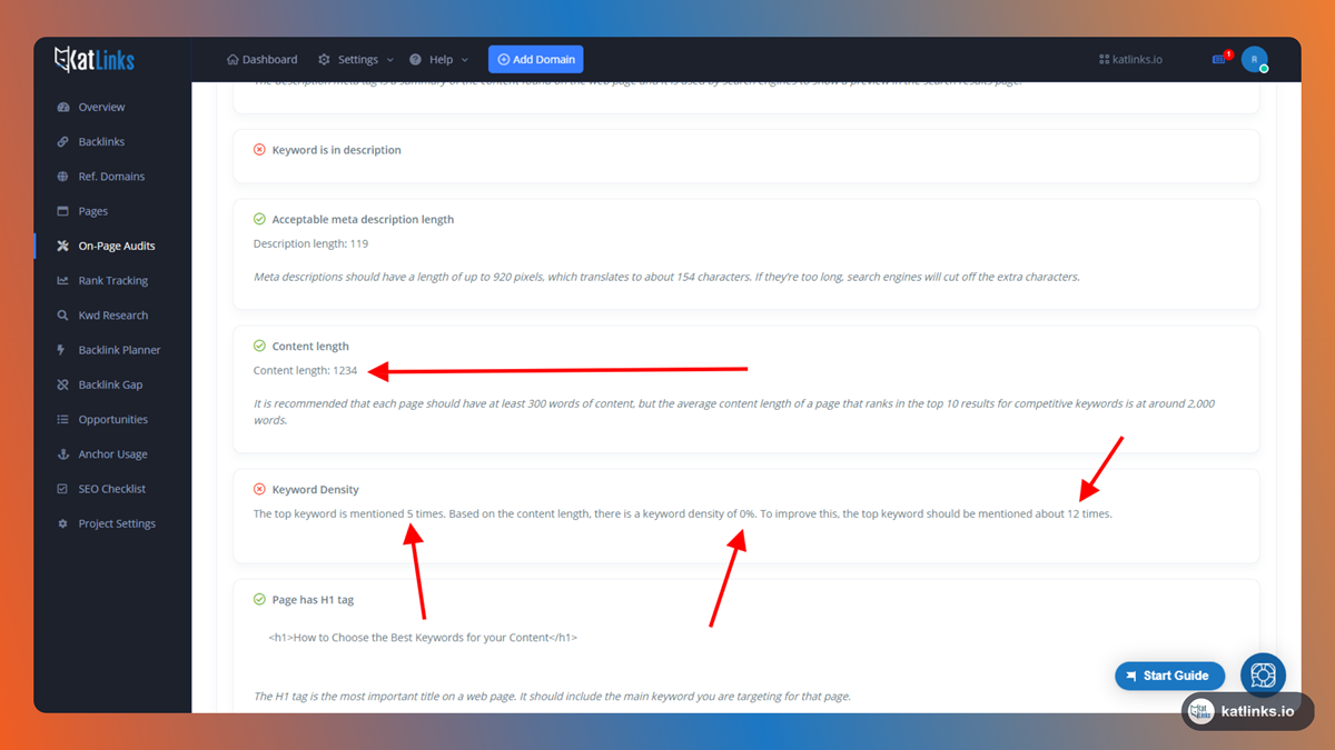 We have added the keyword density feature to the on-page audits. What it does is that based on your content length (number of words) it will recommend how many times you should mention your top keyword, based on the recommended 1% density.